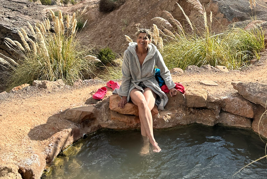 Journée tranquille avec repos dans les eaux thermales , puis cueillette de mûres à l’issue d’une piste improbable. Fin de journée sur un spot de rêve avec dégustation d’un excellent clafoutis … à la mûre !